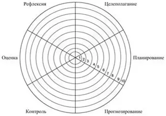 Оси колеса - это шкалы от 1 до 10 баллов. При этом «10» означает уверенное владение данным умением, а «1» - только знание о его существовании. Глядя на полученную фигуру, можно увидеть какие трудности испытывают учащиеся при изучении темы.