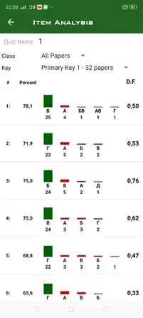 В программе есть также вкладка Item Analysis. В ней Вы можете увидеть полную статистику по пройденным тестам и понять какой вопрос вызвал наибольшее затруднение, а значит плохо был усвоен. Такую статистику можно вести по каждому классу.