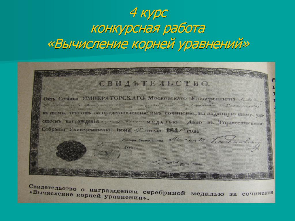 Особых подробностей о том, каким он был студентом, не сохранилось. Похоже, что в университете среди товарищей Пафнутий ничем не выделялся: носил строгий вицмундир, застёгнутый до самого подбородка на все сияющие пуговицы, и неизменную студенческую треуголку с кокардой <Рисунок3>. По всем предметам успевал только на «отлично». Видно, и тут сказалась домашняя выучка Аграфены Ивановны. Лишь на четвёртом курсе Чебышев заставил говорить о себе. На четвёртом курсе студентам полагалось представить своё сочинение в соответствии с выбранной специальностью. За конкурсную работу о вычислении корней уравнений он получил серебряную медаль <Рисунок4>. Студенческое сочинение много лет сохранялось в архиве и увидело свет только в 1951 году.