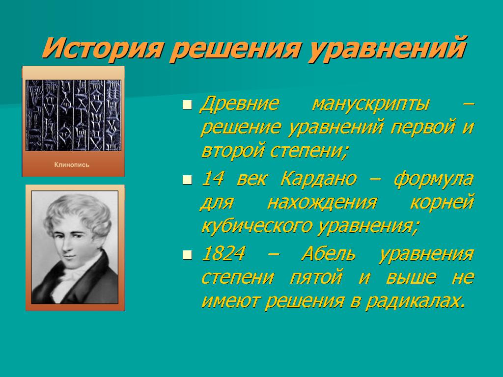 Вопрос, избранный Чебышевым для рассмотрения имеет многовековую историю. Еще в древних манускриптах встречаются примеры задач, где для отыскания ответа требуется решить уравнение первой или второй степени. В XIV веке Кардано вывел формулу для нахождения корней кубического уравнения. Но она довольно, сложна для вычислений. В 1824 году Абель доказал, что уравнения пятой степени и выше вообще не имеют решения в радикалах <Рисунок5>. Для практического применения уравнений вовсе не обязательно найти точное решение, достаточно приближённого решения с определённой точностью.