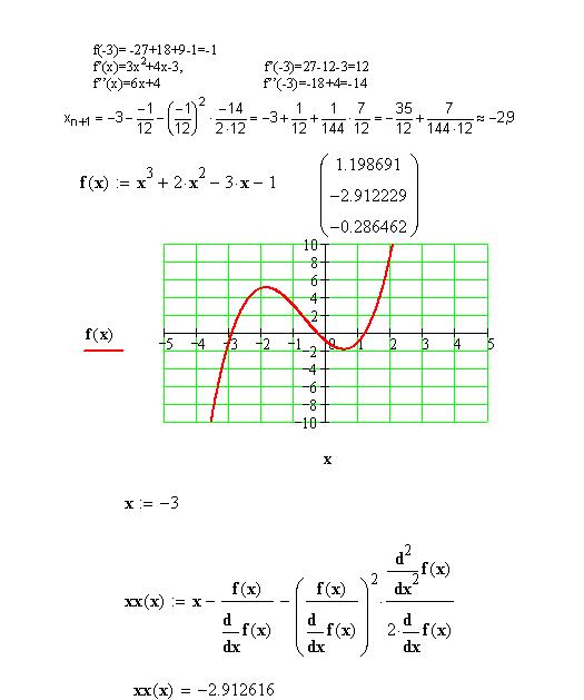 Предлагаю описанным выше способом найти более точное значение корня уравнения близкого к числу -3.