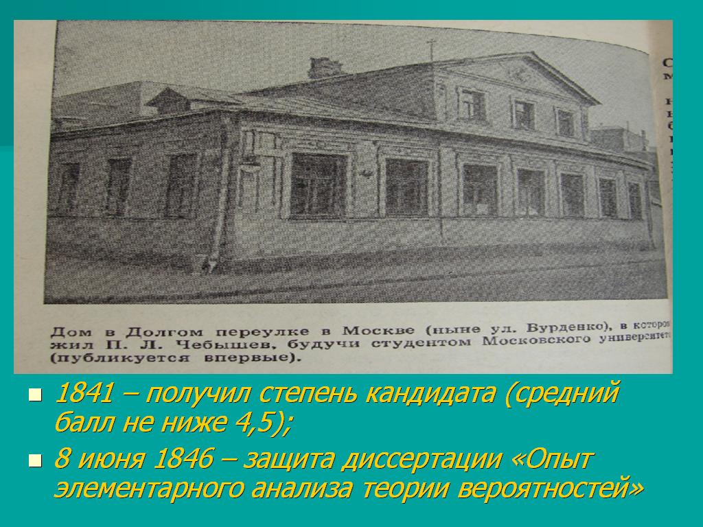 В 1841 году закончилась студенческая жизнь П. Л. Чебышева, и он вышел из университета «первым кандидатом». Степень кандидата присваивалась выпускнику университета, имеющему средний балл по основным предметам не ниже 4,5. После некоторого колебания в выборе жизненного пути он решил посвятить себя науке и стал готовиться к сдаче экзаменов на ученую степень магистра, оставшись, таким образом, при Московском университете ещё на 5 лет.