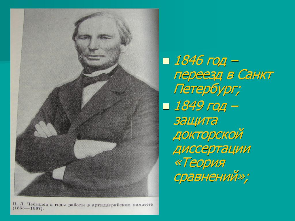 В этом же году младшие братья Чебышева, Николай и Владимир, поступили в Петербургское артиллерийское училище, и Пафнутий Львович покидает Москву. Он хочет помочь братьям в получении образования. Сам он работает в Петербургском университете <Рисунок11>. В 1849 году, он защищает новую диссертацию «Теория сравнений» и получает степень доктора наук. Эта книга на протяжении полувека дважды издавалась в Петербурге, была напечатана в Берлине и Риме, прослужив, таким образом, в качестве учебника по теории чисел несколько десятков лет. В общем, жизнь Чебышева течёт гладко, спокойно.