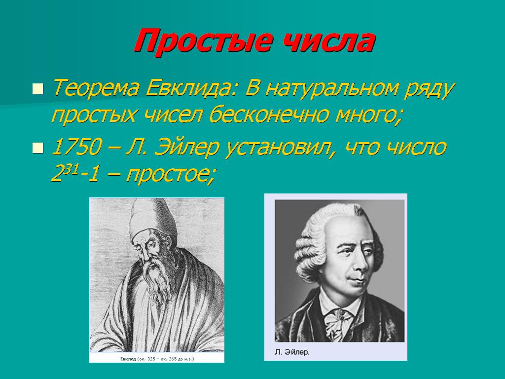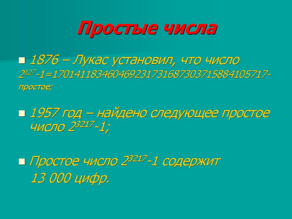 В 1750 году Леонард Эйлер установил, что число 231 -1 является простым <Рисунок13>. Оно оставалось самым большим из известных простых чисел более сто лет. В 1876 году французский математик Лукас установил, что огромное число