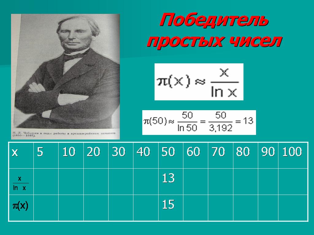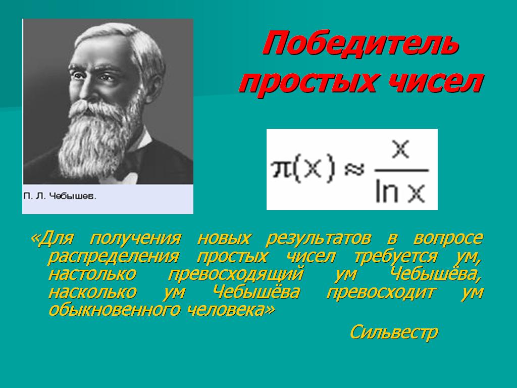 Знаменитый английский математик Дж. Сильвестр (1814-1897) имел обыкновение давать ценимым им учёным выразительные прозвища. Одного из великих гениев математики, Пафнутия Львовича Чебышева, за открытия в области простых чисел он назвал «победителем простых чисел».