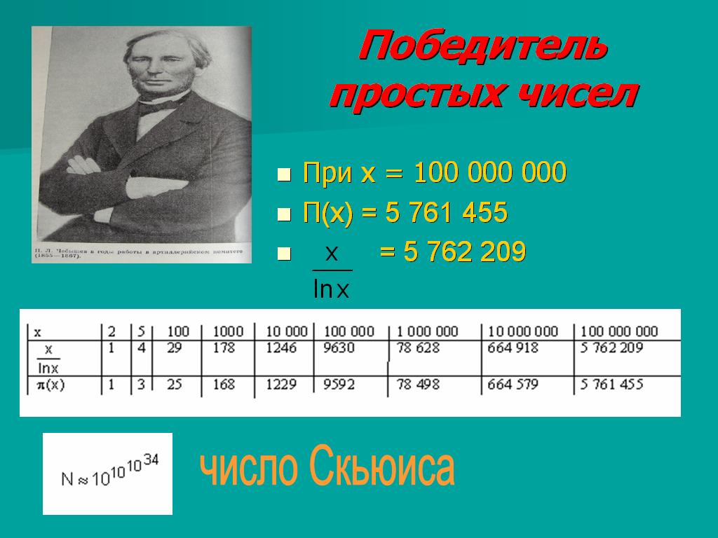 Вообще говоря, формула Чебышева даёт несколько завышенные значения, особенно в начале ряда. Но уже при стомиллионном числе эта разница почти не ощутима (5 762 209 вместо фактических 5 4761 455). Пройдёт немного времени после опубликования трудов Чебышева, и английский математик Литлвулд докажет, что в ряду простых чисел существует некое число, около которого числа Чебышева оказываются уже не больше, а меньше действительного количества простых чисел. Через два десятка лет это таинственное число нащупали. Оно больше всех других известных науке чисел-гигантов. Это так называемое число Скьюиса.