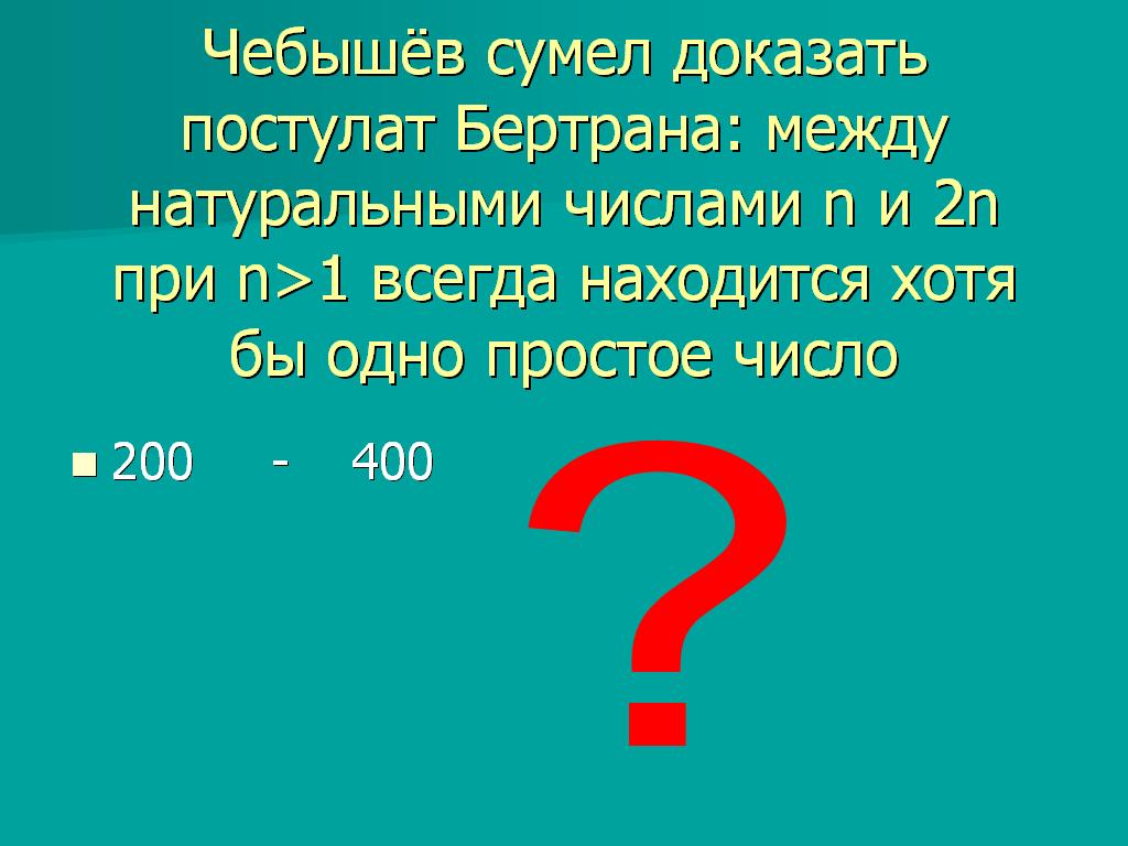 Чебышев так же сумел доказать постулат Бертрана: между натуральными числами n и 2n при n>1 всегда находится хотя бы одно простое число <Рисунок18>.