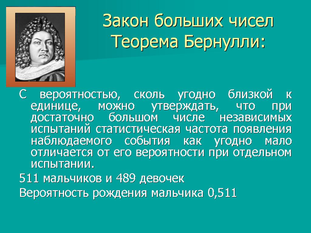 Теорема Бернулли служит базой для приближённой оценки неизвестных вероятностей случайных событий. Длительные наблюдения над рождениями установили, что в среднем на каждую 1000 рождений приходится 511 мальчиков и 489 девочек. Отсюда делается вывод, что вероятность рождения мальчика приблизительно равна 0,511. По вероятности рождения мальчика делаются серьёзные прогнозы о составе населения.