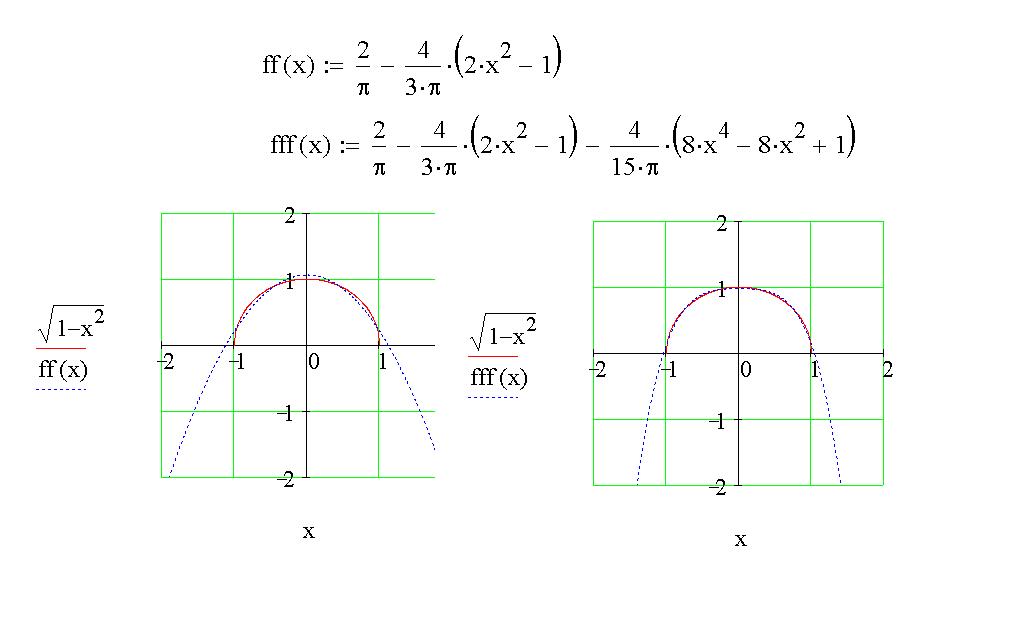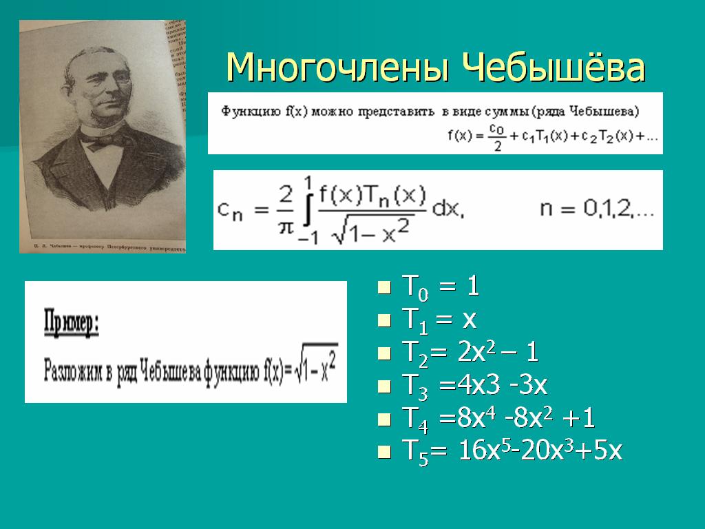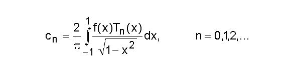Функцию f(x) можно представить в виде суммы (ряда Чебышева) <Рисунок24>, где Тn(x)- многочлены Чебышева, определяющиеся следующей формулой <Рисунок24>. Т0(х)=1; Т1(х)=х. Для вычисления многочленов Чебышева можно воспользоваться следующим рекуррентным соотношением:
