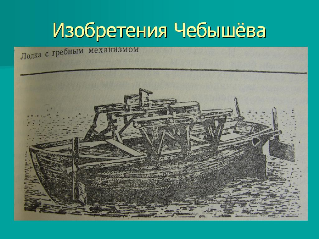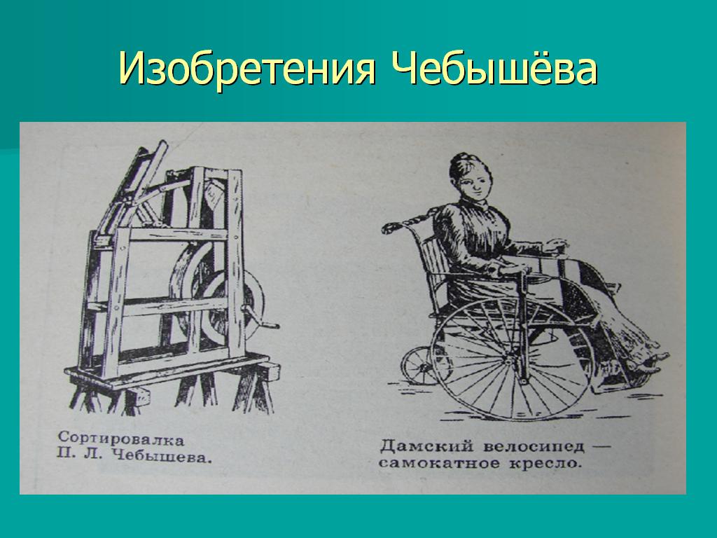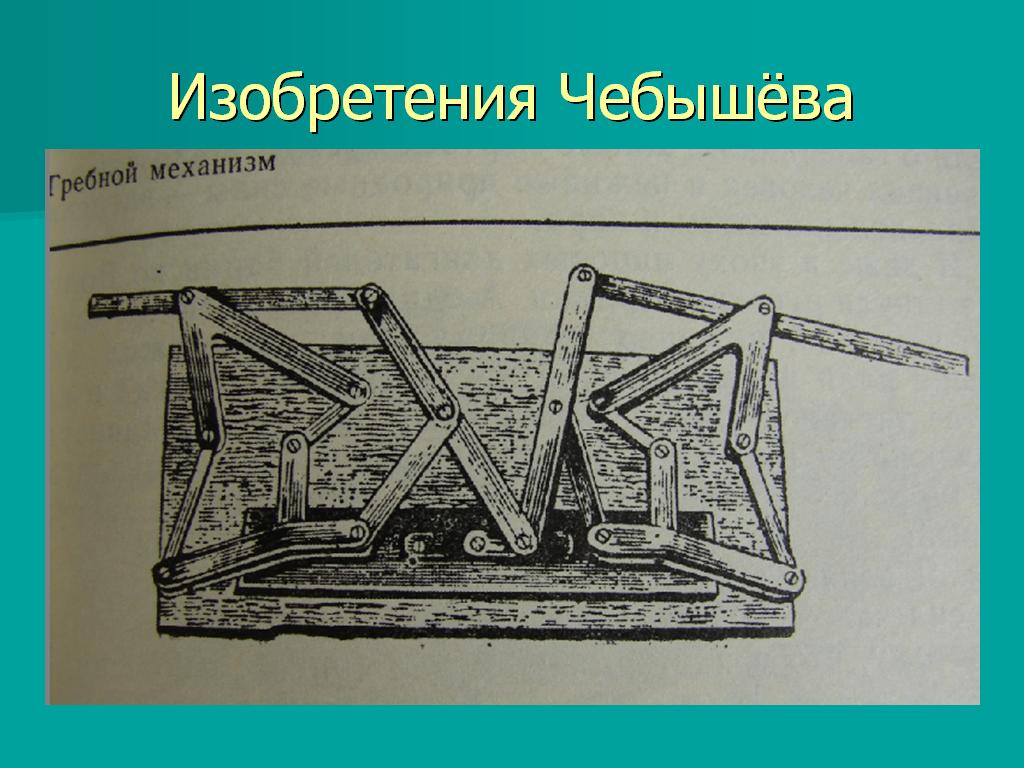 С раннего детства в нём развивалось стремление к устройству всевозможных приборов. Начав с простых игрушек из лучинок и палочек, сделанных перочинным ножиком, Чебышев дошёл впоследствии (уже взрослым) до сложной математической машины арифмометра. Эта любовь к изобретению механизмов сохранилась навсегда. Всю жизнь Чебышев занимался вопросами практической механики и изобрёл много остроумных механизмов: сортировальную машину, самокатное кресло <Рисунок29>, гребной механизм <Рисунок30>, <Рисунок31>, арифмометр <Рисунок32>, стопоходящую машину, подражающую движениям животного при ходьбе и другие <Рисунок33>. За механизмы, показанные на выставке 1893 года в Чикаго, Чебышев был премирован и награждён.