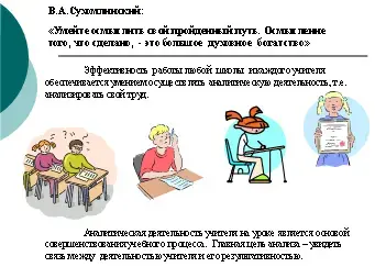 Эффективность работы любой школы и каждого учителя обеспечивается умением осуществлять аналитическую деятельность, т.е. анализировать свой труд. Еще Сухомлинский сказал: «Умейте осмыслить свой пройденный путь. Осмысление того, что уже сделано, - это большое духовное богатство».