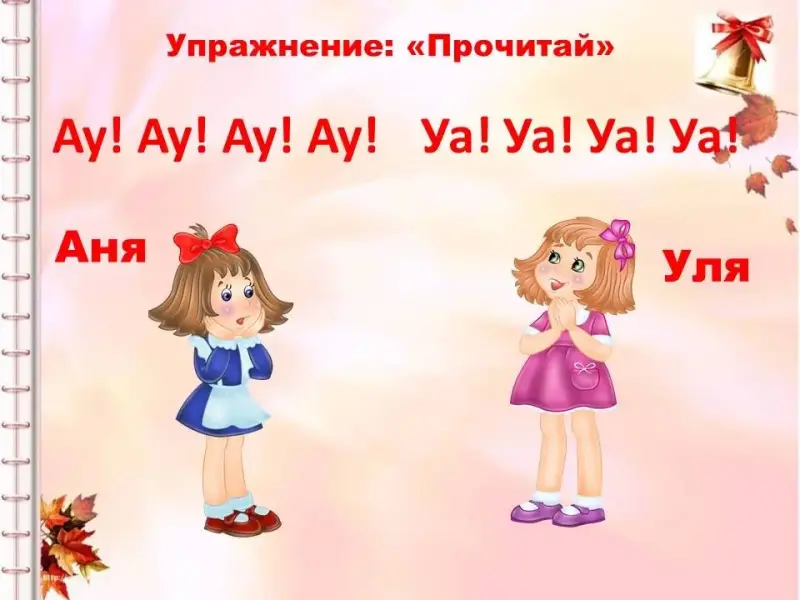 - Аня и Уля играют. Сначала Аня произносит «А», а потом Уля произносит «У». Что у них получится вместе? («АУ».) Теперь Уля сначала произносит «У», а потом Аня произносит «А». Что у них получилось вместе? («УА».)