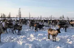 6. В Мурманской области находится третье в рейтинге РФ по поголовью скота оленеводческое хозяйство СПК «Тундра» (с. Ловозеро). Его общее поголовье составляет 12 665 голов. Обычно олени в большом количестве пасутся под открытым небом, на огромных площадях земли и за ними наблюдает пастух-оленевод.