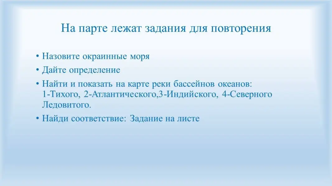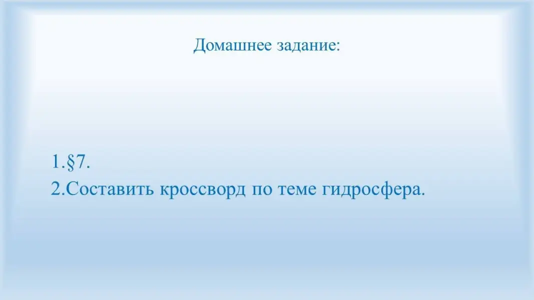 - принять правила поведения на уроке; осознать специфику вод суши на примере характеристики ледников и многолетней мерзлоты |