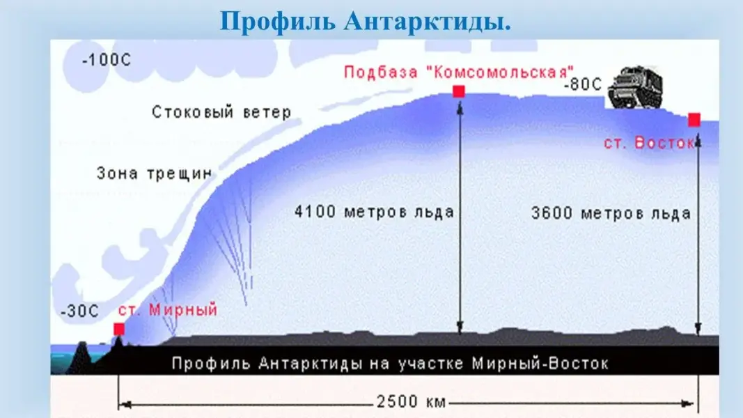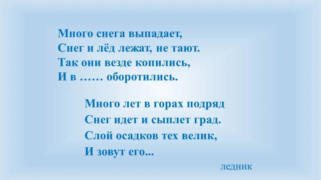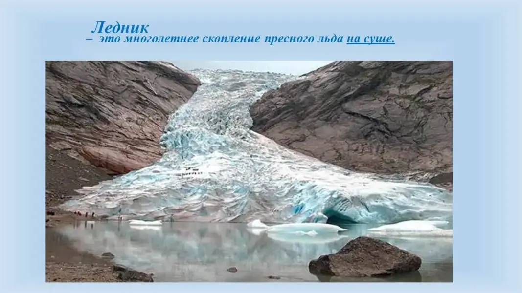 Непрерывное движение льда приводит к образованию айсбергов. (Демонстрация слайда, картин и рисунка учебника)