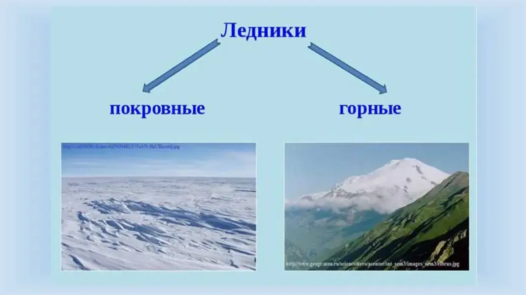 Среди ледников выделяют два вида. Как вы назовете их, глядя на рисунок?