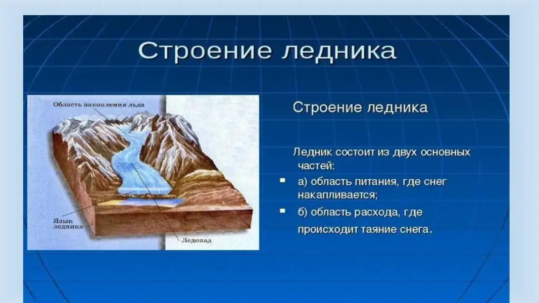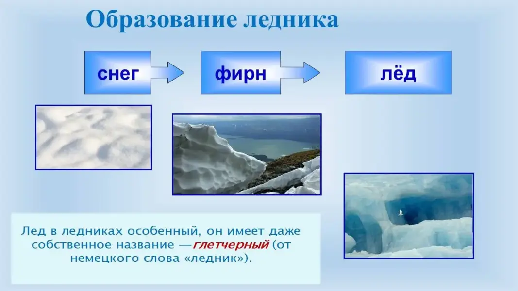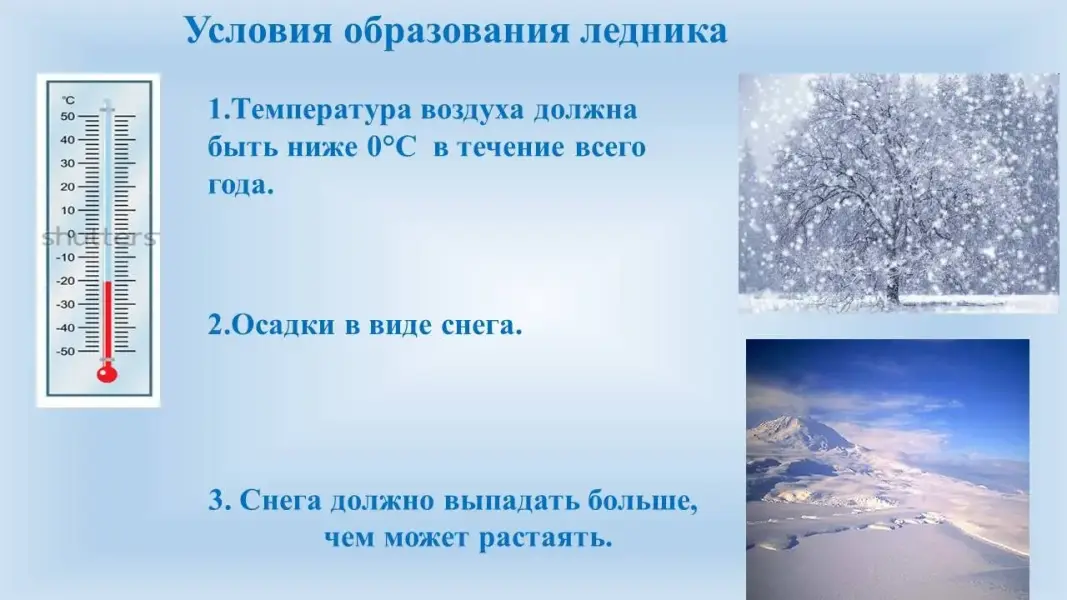 Итак, вы узнали, что такое ледник и условия его образования. При исключении любого из этих факторов образование ледника невозможно.