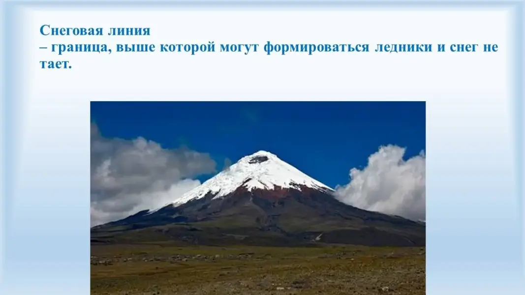 Снеговая линия - это граница, выше которой снег не тает, а накапливается, образуя ледник.