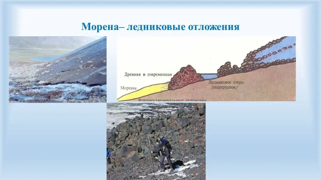 МОРЕНЫ - это скопление обломков горных пород при таянии ледника.