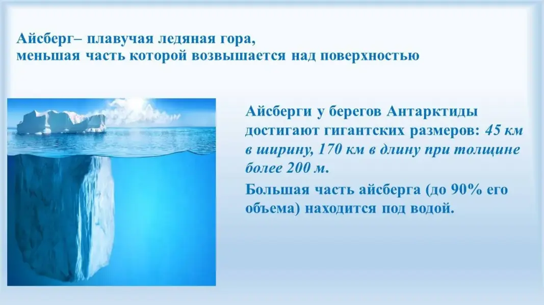 Айсберги у берегов Антарктиды достигают гигантских размеров: 45 км в ширину, 170 км в длину при толщине более 200 м). Большая часть айсберга (до 90% его объема) находится под водой. Больше всего льда в Антарктиде. Ученые многих стран, в том числе и России, изучают этот материк, т.к. он таит еще много загадок. Вот как описывает очевидец это явление: