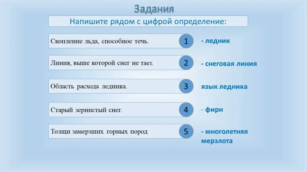 - называть и показывать области распространения ледников и многолетней мерзлоты на Земле;