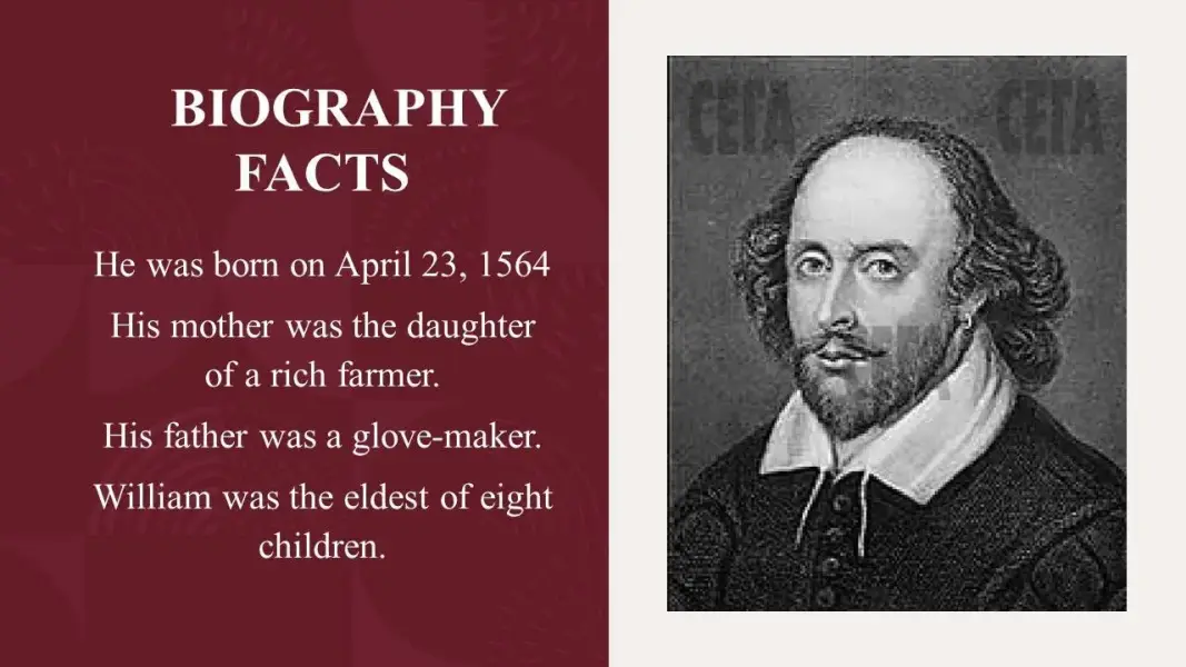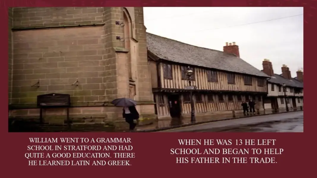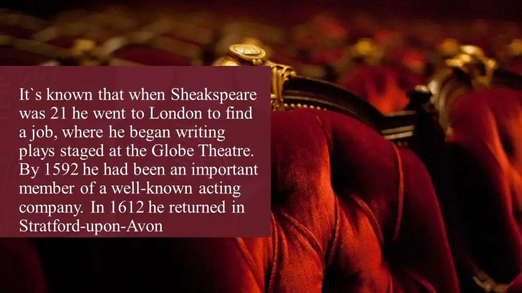 Известно, что Шекспиру было 21, когда он уехал в Лондон искать работу. Там он начал писать пьесы для театра Глобус. В 1612 году вернулся в Стратфорд. |