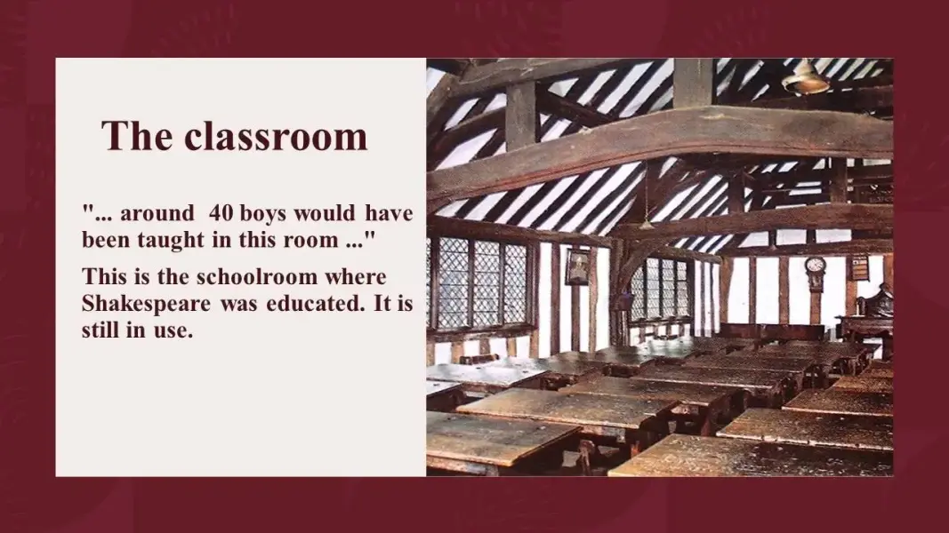This is the schoolroom where Shakespeare was educated. Around 40 boys would have been taught in this room. It is still in use |