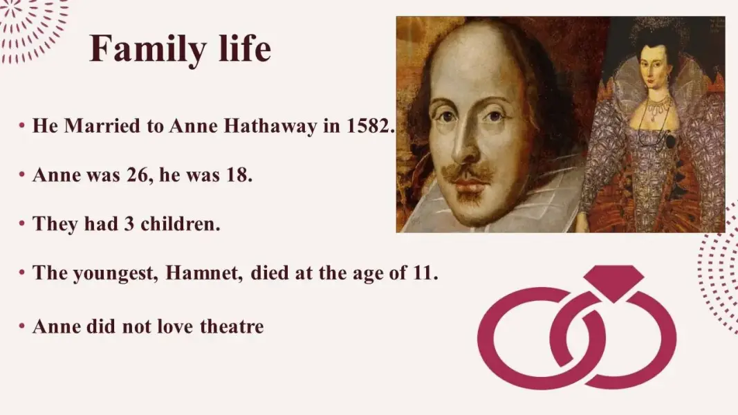 А сейчас давайте узнаем несколько фактов о семейной жизни Шекспира и вы поможете мне прочитать и перевести следующие предложения. |