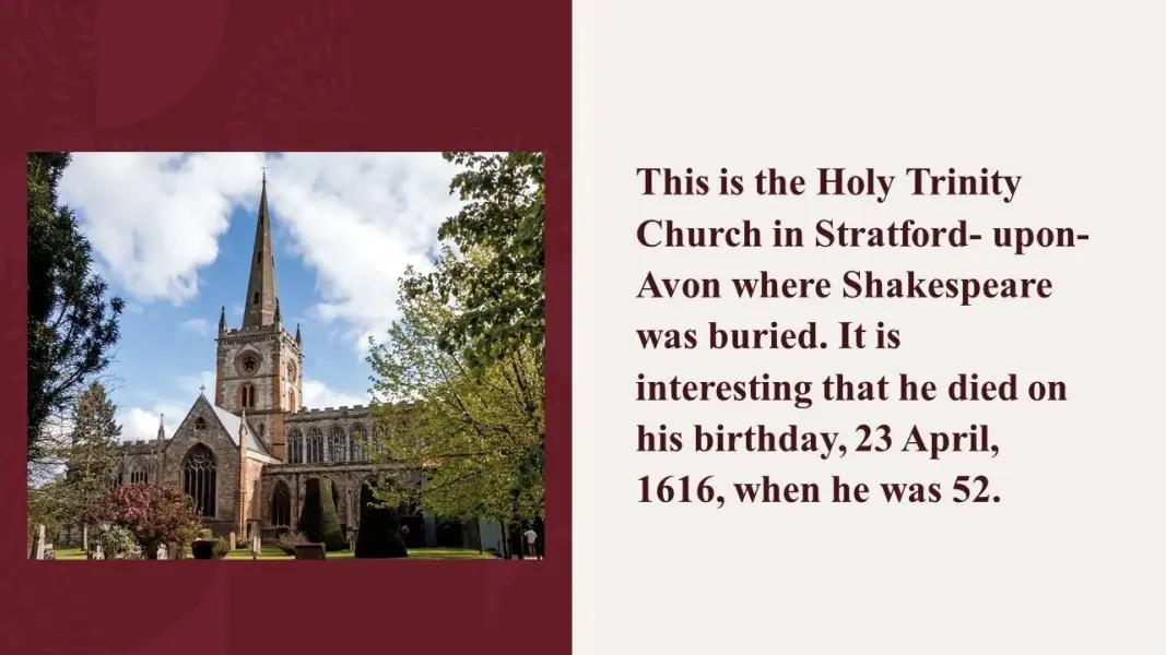 Это церковь Святой Троицы в родном городе Шекспира, где он был похоронен. Интересно, что число и месяц его рождения и смерти совпадают. |