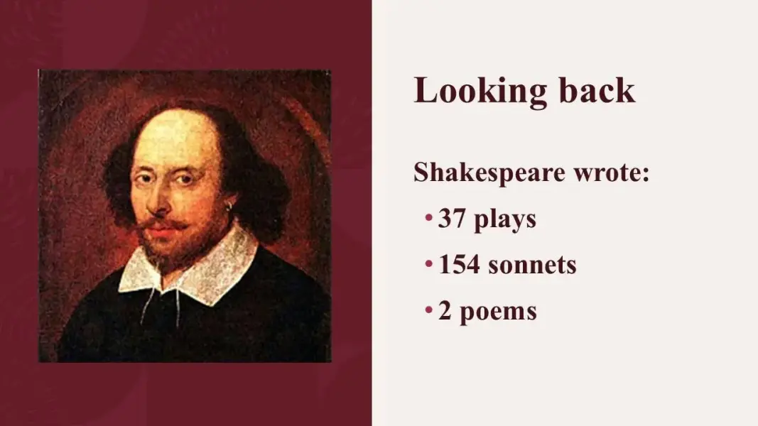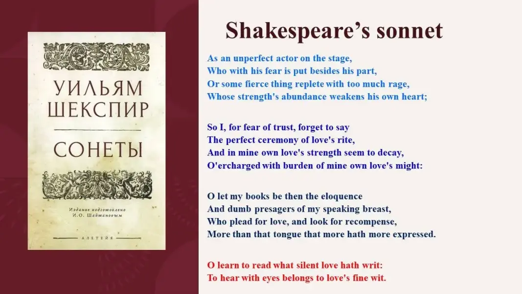 Шекспир был выдающимся поэтом всех времён. Он славится и сейчас своими стихами о любви, жизни, дружбе, которые называют сонетами. Как же выглядят сонеты? Об этом нам расскажет Сергеева Вероника. |