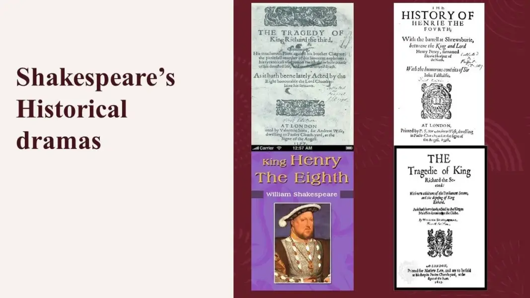 Поэт писал разные по жанру пьесы: комедии, трагедии, исторические драмы. Давайте пролистаем каталог Шекспировских произведений. Читаем названия произведений со слайда по очереди |