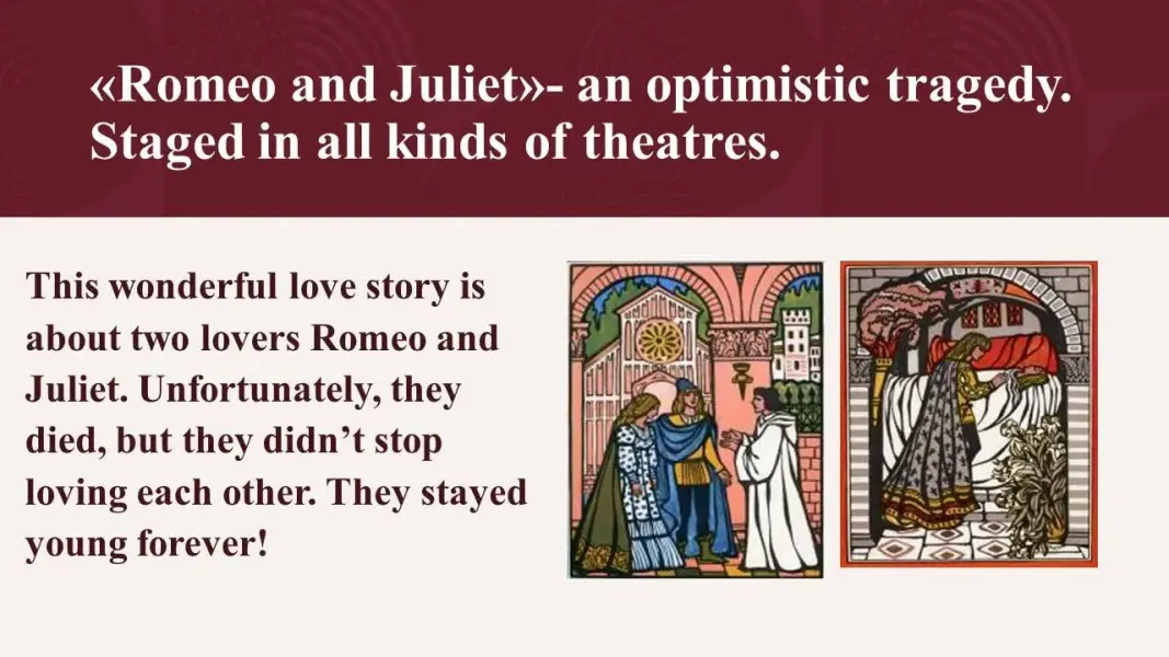 This wonderful love story is about two lovers Romeo and Juliet. Unfortunately, they died, but they didn't stop loving each other. They stayed young forever |