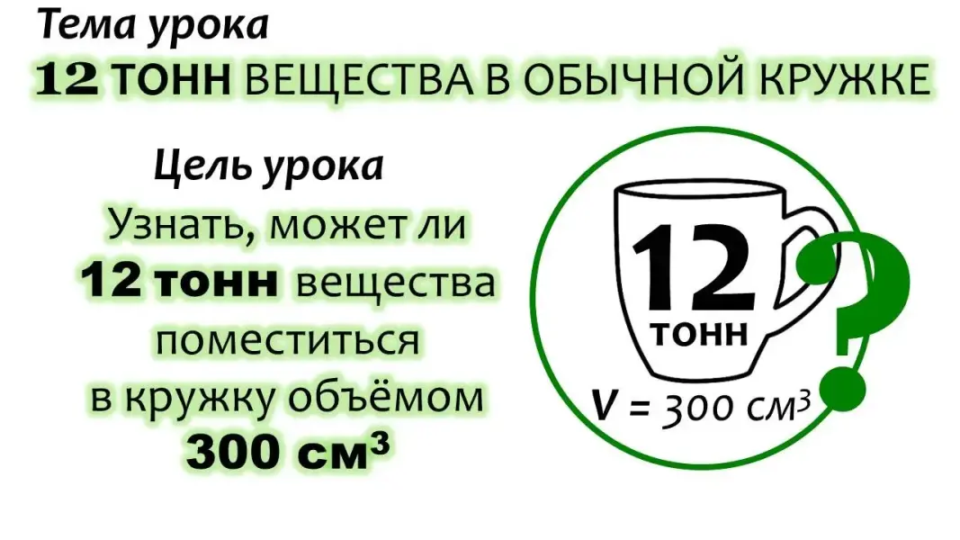 Возможно, ли 12 тонн вещества поместить в обычную кружку объёмом 300 кубических сантиметров? Сегодня вместе с вами я бы хотел ответить на этот вопрос.