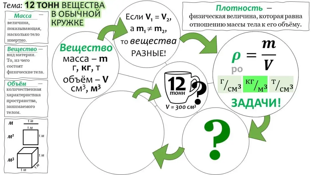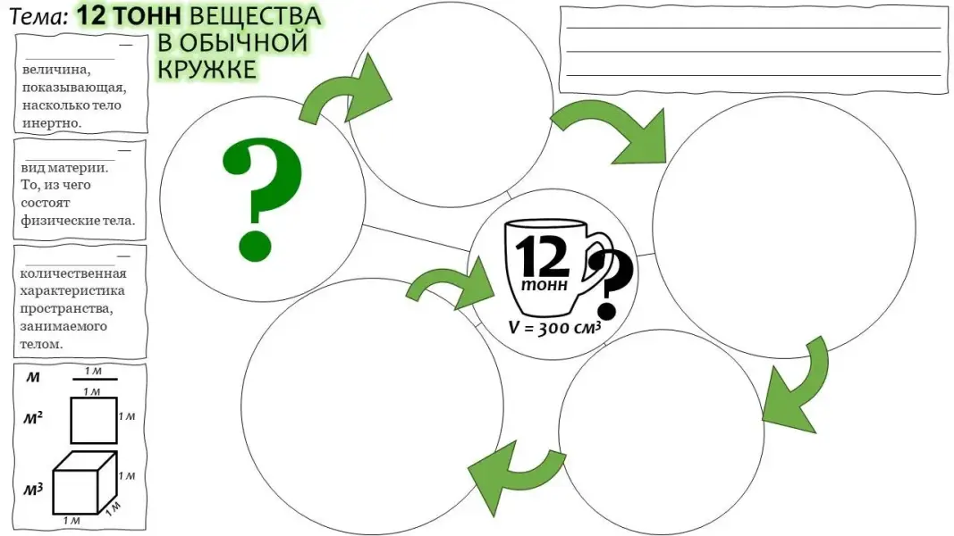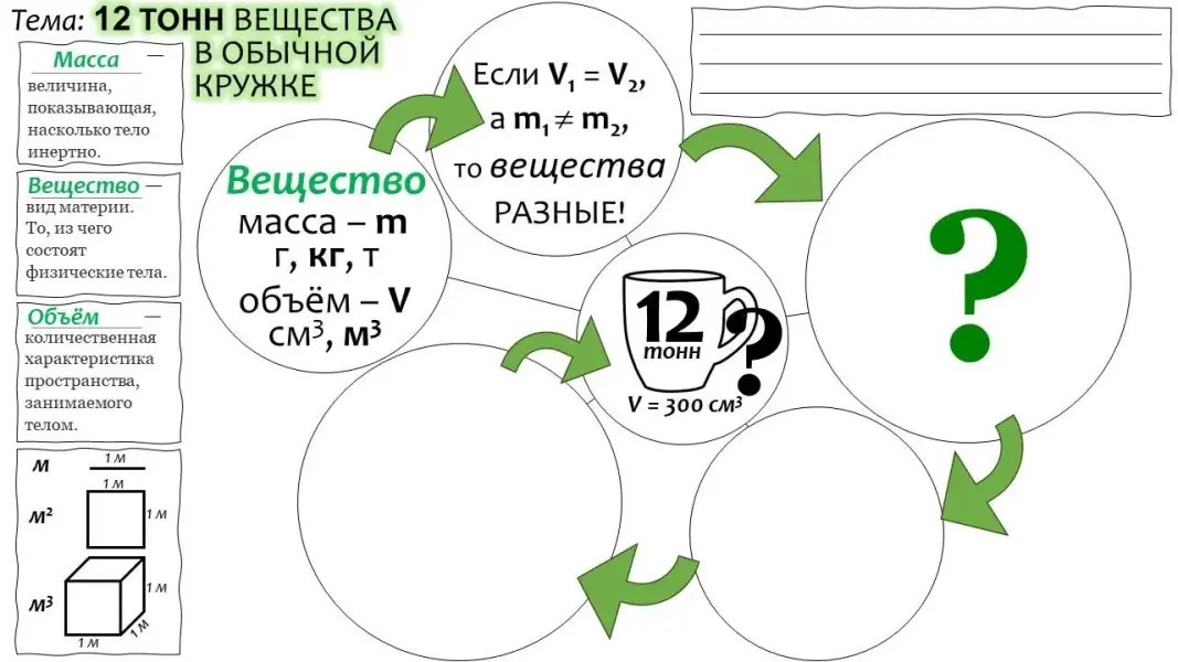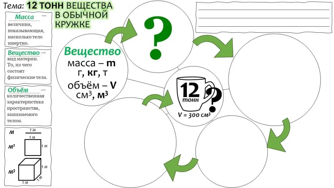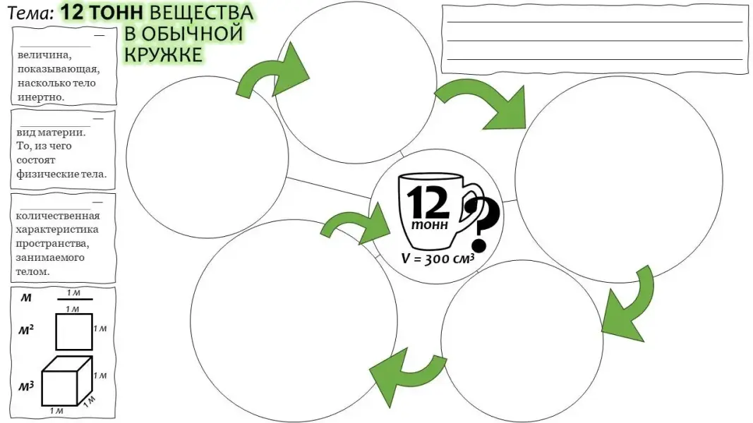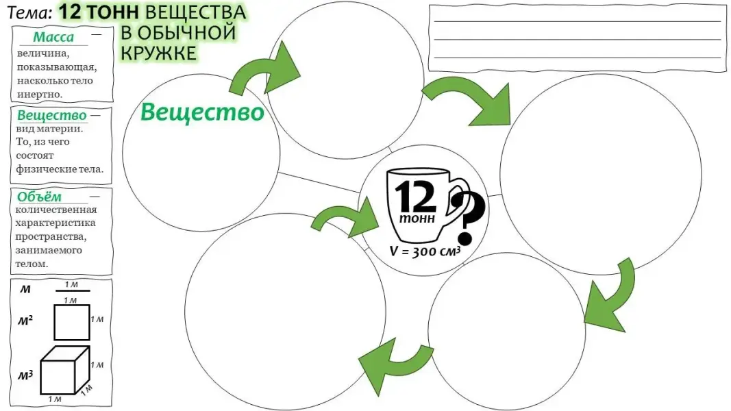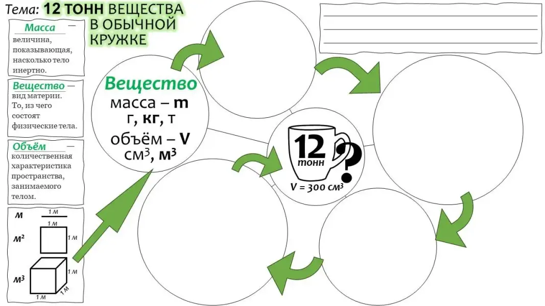 Слайд 7. А в центре - цель, к которой мы будем двигаться - узнать, может ли 12 тонн вещества поместиться в кружку объёмом 300 кубических сантиметров.