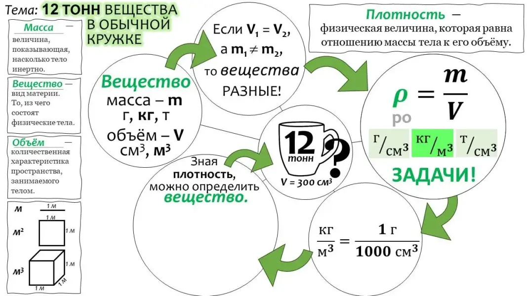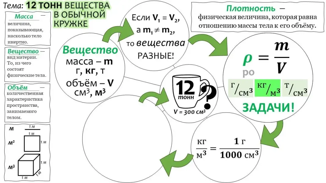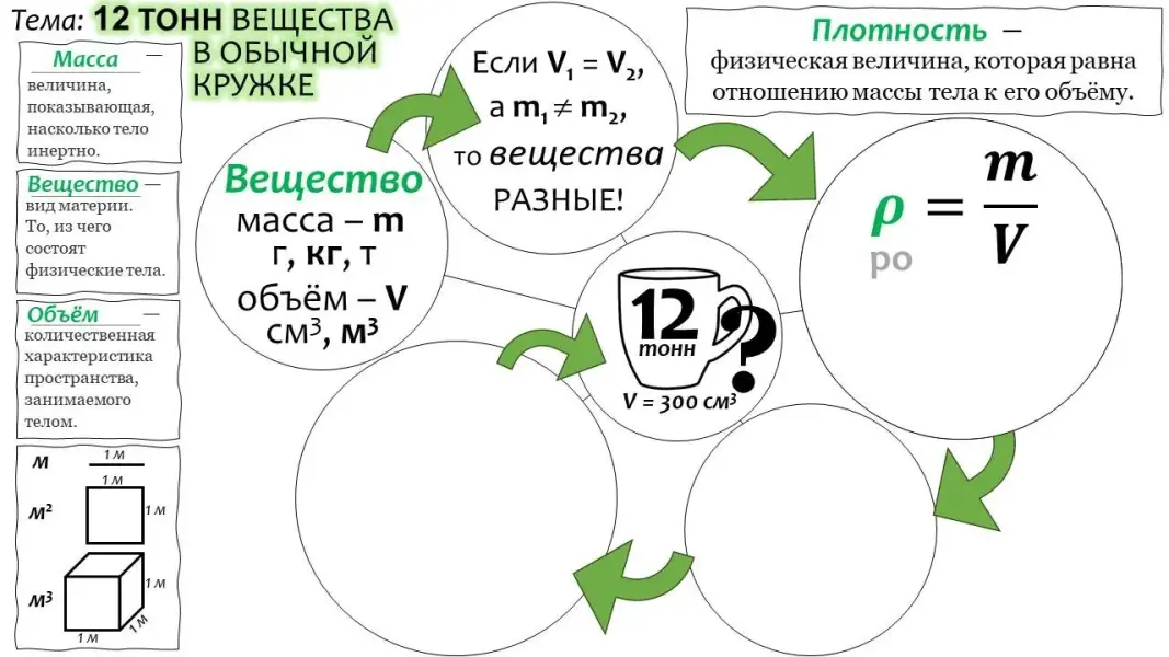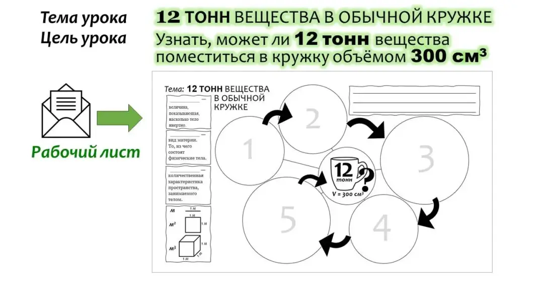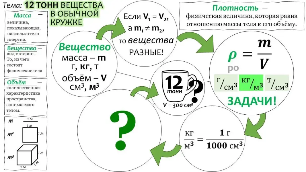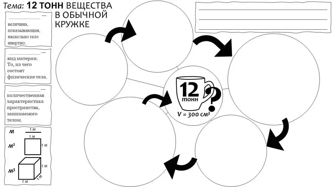 Слайд 7. А в центре - цель, к которой мы будем двигаться - узнать, может ли 12 тонн вещества поместиться в кружку объёмом 300 кубических сантиметров.