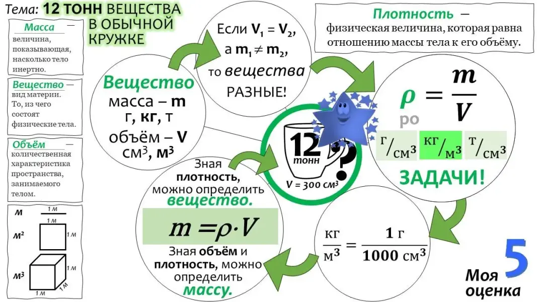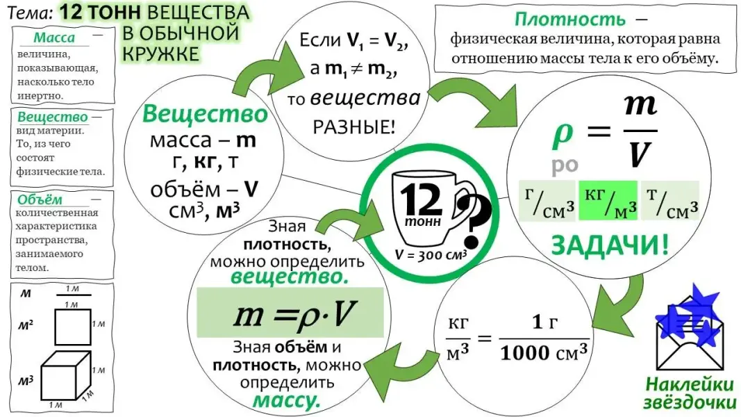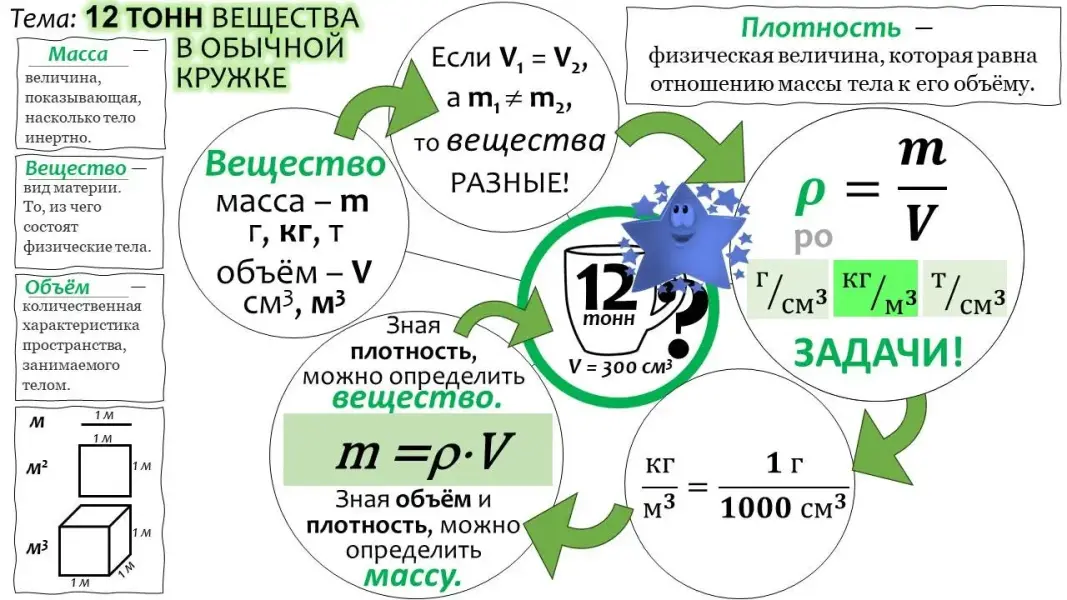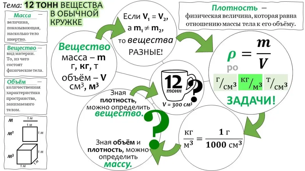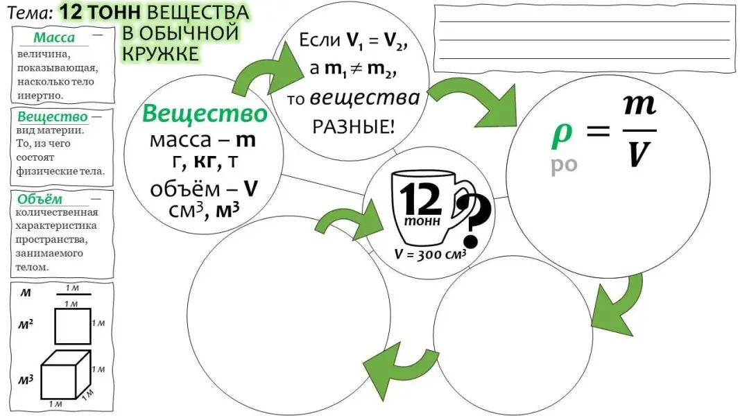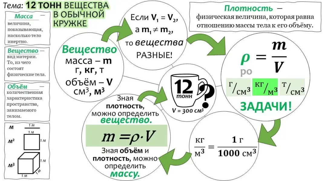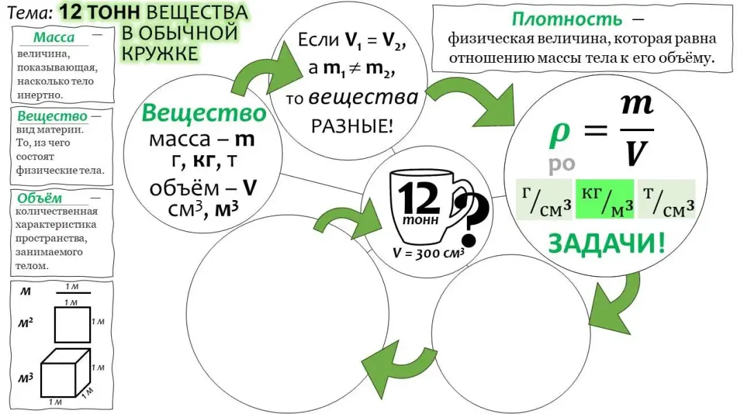 Слайд 7. А в центре - цель, к которой мы будем двигаться - узнать, может ли 12 тонн вещества поместиться в кружку объёмом 300 кубических сантиметров.