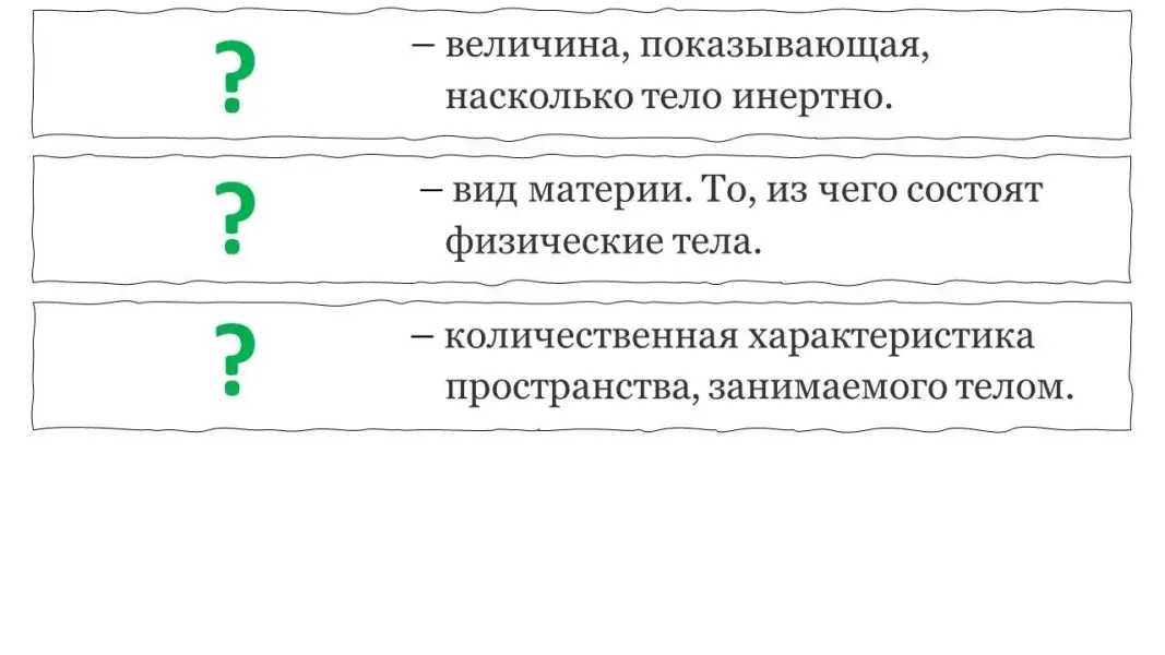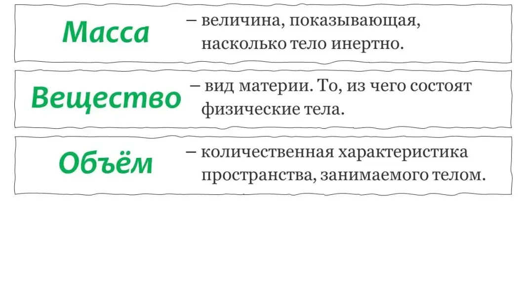 Сегодня мы уже говорили о массе, объёме и веществе. Это знакомые или новые для нас понятия? Давайте вспомним их определения. На Рабочем листе в левой части есть определения. Запишите, пожалуйста, термины, к которым они относятся.