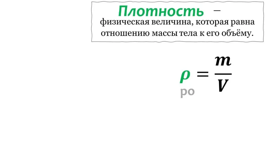 Слайд 19. Эта величина обозначается греческой буквой r (читается «ро»), r = m/V. Запишите в Рабочем листе. Называется эта величина плотностью вещества. Из формулы давайте выведем определение плотности. Плотность - физическая величина, которая равна отношению массы тела к его объёму.