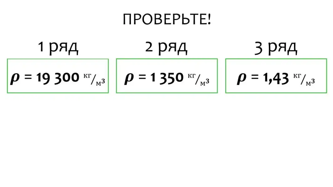 Слайд 33. Переведите полученное вами значение плотности из кг/м3 в г/см3. Время выполнения - 1 минута. Что получилось? Первый ряд, ваш ответ?