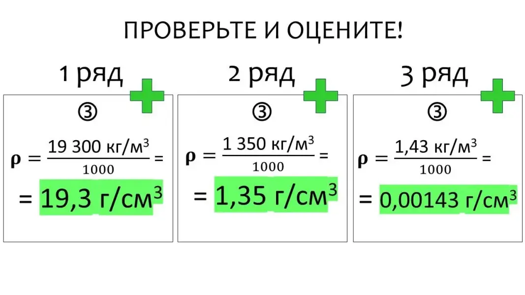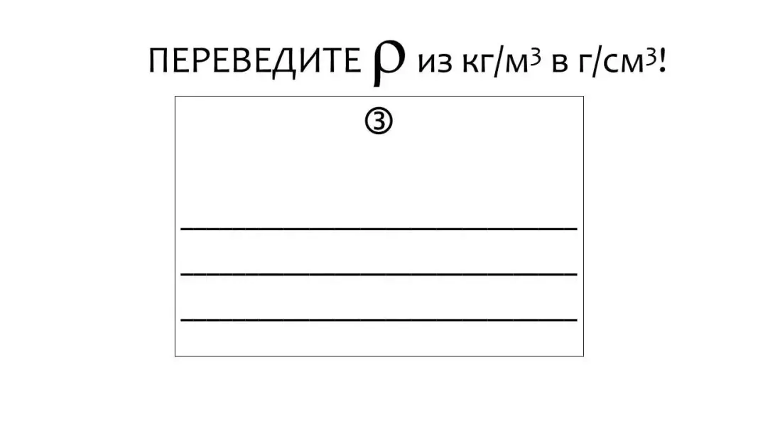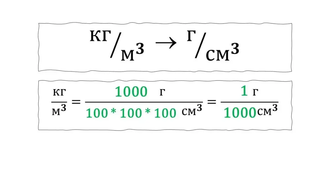 Так и есть. В одном килограмме 1000 граммов. В одном метре 100 сантиметров, а в кубическом метре 100*100*100 сантиметров. Эти знания помогут нам перевести кг/м3 в г/см3. Подставим их в формулу.