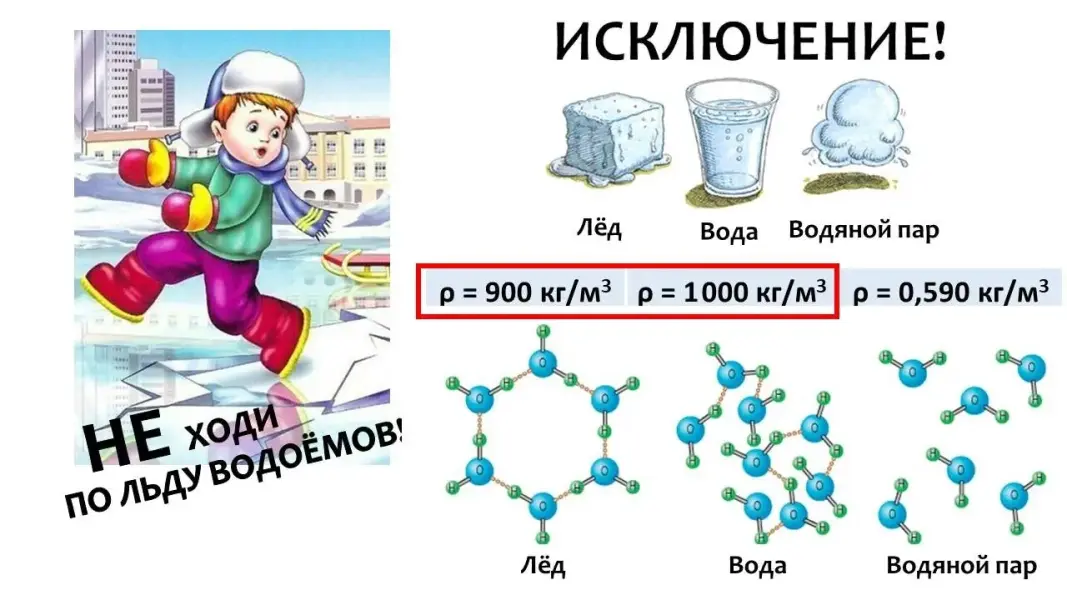 Слайд 40. Исключение - лёд и вода. Лёд - твёрдое состояние воды, но его плотность меньше, чем плотность жидкой воды. Лёд плавает на воде, потому что он менее плотный, чем вода. Даже если в воде есть трещины, он не потонет в ней. Об этом нужно помнить, выходя на лёд. Катайтесь на коньках и играйте в хоккей только на специально созданных катках. Не выходите не лёд водоёмов, это опасно!