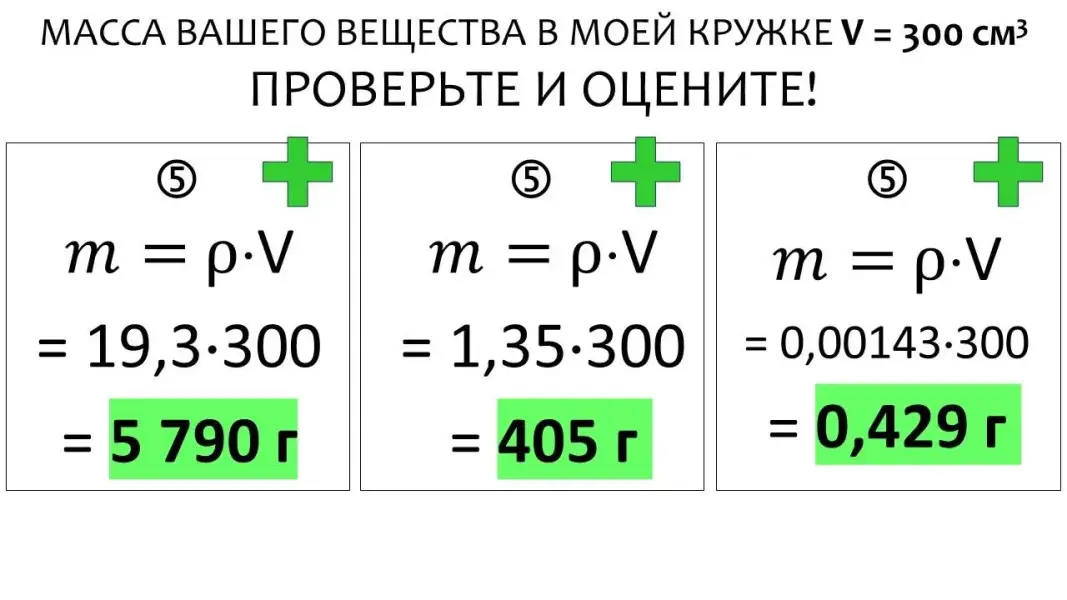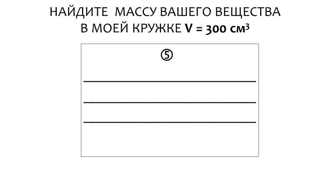 Слайд 43. Найдите массу вашего вещества, которая поместится в объёме моей кружки. Время - 1 минута.