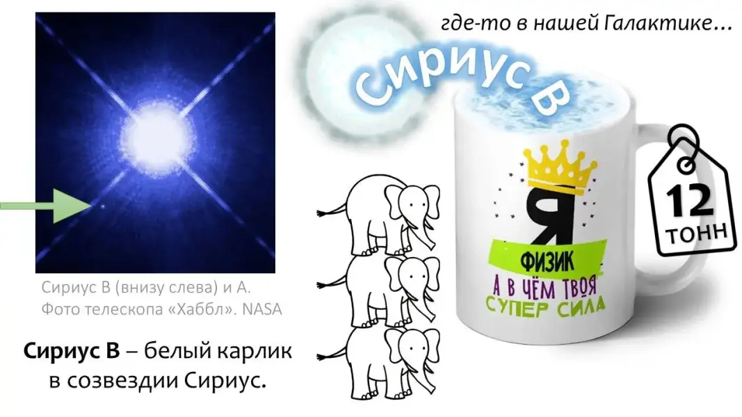 Слайд 49. Верно, в космосе. В созвездии Большого Пса есть система из двух звёзд: Сириус А и Сириус В. Сириус В - белый карлик. Его масса близка к солнечной, а размер близок к размеру Земли. Представляете, какая у него большая плотность! Если бы мы смогли зачерпнуть вещество Сириуса В нашей кружкой, то её масса стала бы 12 тонн. Это масса трёх слонов в одной кружке!