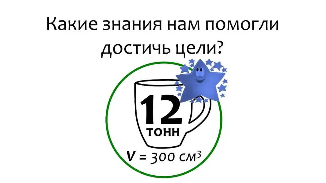 Слайд 5. Верно. Целью будет узнать, может ли 12 тонн вещества поместиться в кружку объёмом 300 кубических сантиметров.
