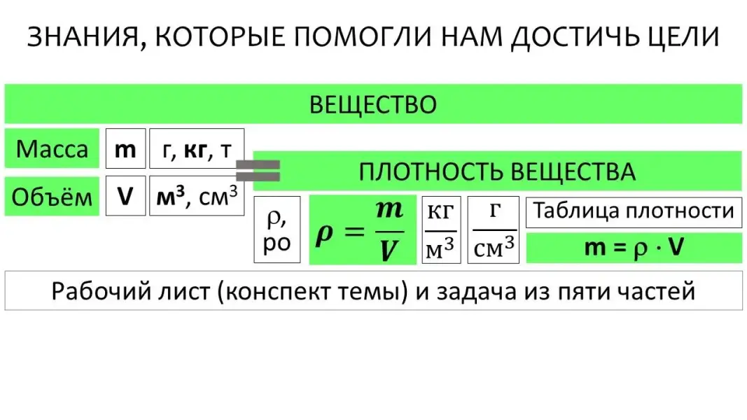 Слайд 54. Верно. Наши знания о веществе, массе и объёме и новые знания о плотности вещества помогли нам достичь цели. Мы заполнили Рабочий лист, у нас получился конспект темы. Он пригодится вам на следующих уроках. Новые знания мы применили для решения задачи из пяти частей.