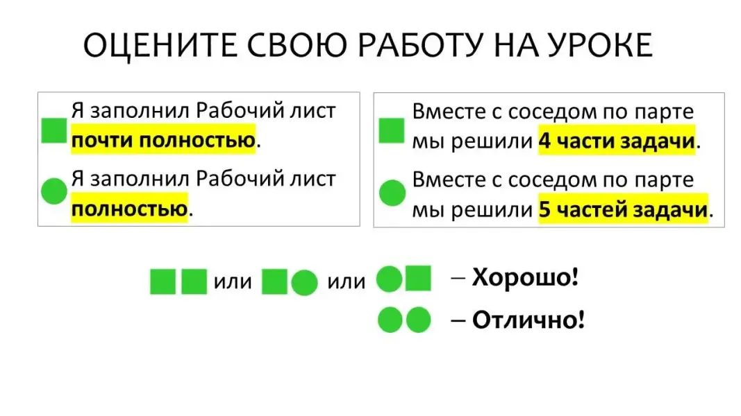 Слайд 55. Пришло время вам оценить свою работу на уроке. На пути к нашей цели вы заполняли Рабочие листы и решали задачу из пяти частей. Если вы сделали всё, то это отличный результат! Если почти всё - хороший. Оцените свою работу