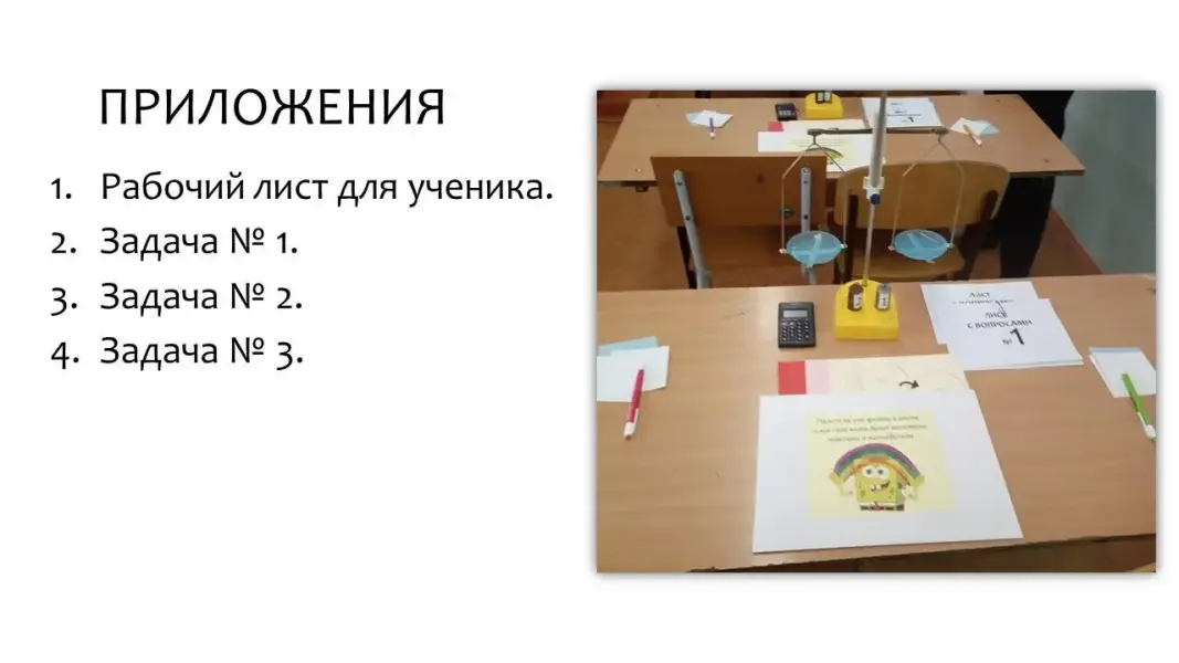 - На каждом столе: рычажные весы, две гирьки с приклеенными номерами 1 и 2, одинакового объёма, но разной массы. На гирьках не должно быть обозначений массы.