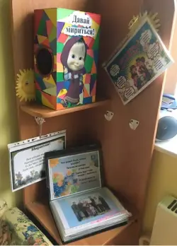 3. Завершающий. Ширма была установлена, благоустроена и представлена детям и родителям. Знакомим ребят с созданным новым местом для уединения, возможностями игр в нём. Там можно справиться с отрицательными эмоциями, побеседовать, снять напряжение. Уголок был оснащён «коробкой - мирилкой» для для преодоления конфликтных ситуаций между детьми. |