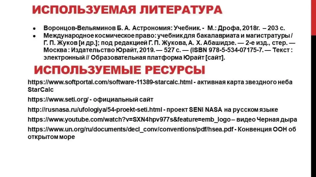 - Международное космическое право: учебник для бакалавриата и магистратуры / Г.П.Жуков [и др.]; под редакцией Г.П.Жукова, А.Х.Абашидзе. - 2-е изд., стер. - Москва : Издательство Юрайт, 2019. - 527 с. - (ISBN 978-5-534-07175-7. - Текст: электронный // Образовательная платформа Юрайт [сайт].