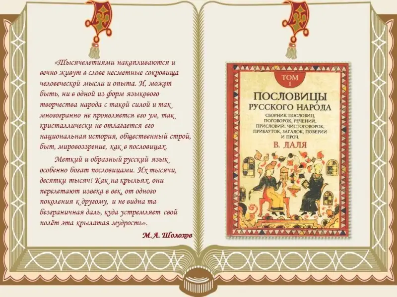 Русский народ создал огромную изустную литературу. Во вступительном слове к сборнику Владимира Ивановича Даля «Пословицы и поговорки русского народа» Михаил Александрович Шолохов пишет: «Тысячелетиями накапливаются и вечно живут в слове несметные сокровища человеческой мысли и опыта. И, может быть, ни в одной из форм языкового творчества народа с такой силой и так многогранно не проявляется его ум, так кристаллически не отлагается его национальная история, общественный строй, быт, мировоззрение, как в пословицах.